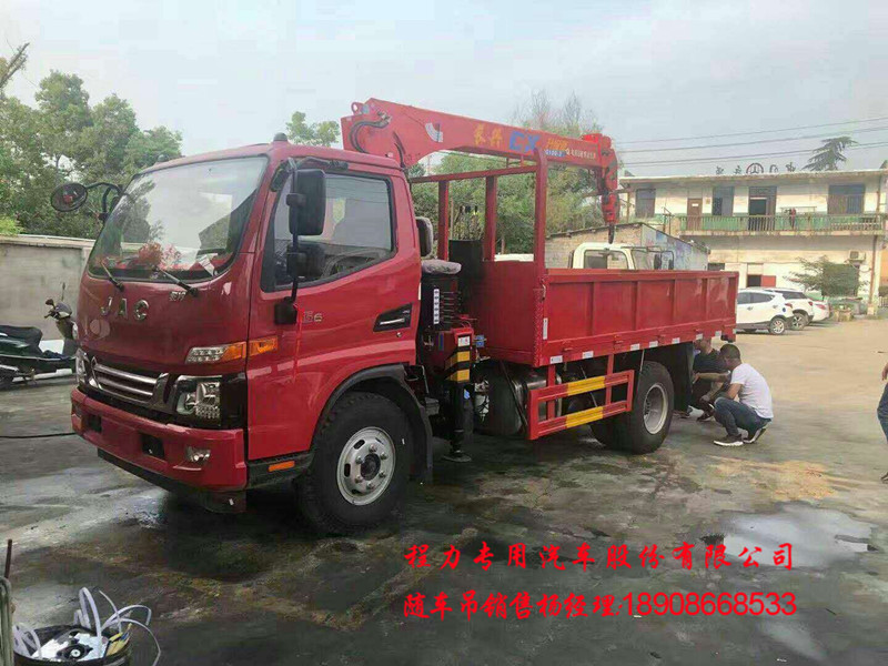 江淮随车吊,蓝牌随车吊,HCQ5046JSQHF5型随车起重运输车,选配排半驾驶室,此车型有三种配置可选:(1)1995单排骏铃年度驾驶室,D30云内(16气门)156马力,五档带副变速箱,8吨后桥,200mm双层大梁,8.25R16钢丝胎,原厂空调,电动门窗,ABS,断气刹,铝合金油箱,轴距3400mm,外形尺寸:5995*2300*3470,货厢尺寸:3500*2300*600;(2)2071单排骏铃V6驾驶室,云内156马力发动机,六安6档变速箱,8吨后桥,8.25R16钢丝胎,216mm大梁(8mm厚),ABS,断气刹,中控锁,原厂空调,电动门窗,铝合金油箱,多功能方向盘,轴距3400mm,外形尺寸:5995*2400*3470,货厢尺寸:3500*2300*600;(3)1890单排骏铃,V5驾驶室,锐捷特153马力,7.50R16钢丝胎,英国里卡多6档变速箱,200mm高强钢大梁,6.5吨后桥,ABS,断气刹,原厂空调,多功能方向盘,中控锁,电动门窗,铝合金油箱,轴距3300,外形尺寸:5995*2400*3000,货厢尺寸:3500*2300*550,可选装2~5吨各品牌直折臂吊机,配置不同,价格也不一样,只选对的,不买贵的,用户可根据自己需求,选择适合自己的配置。